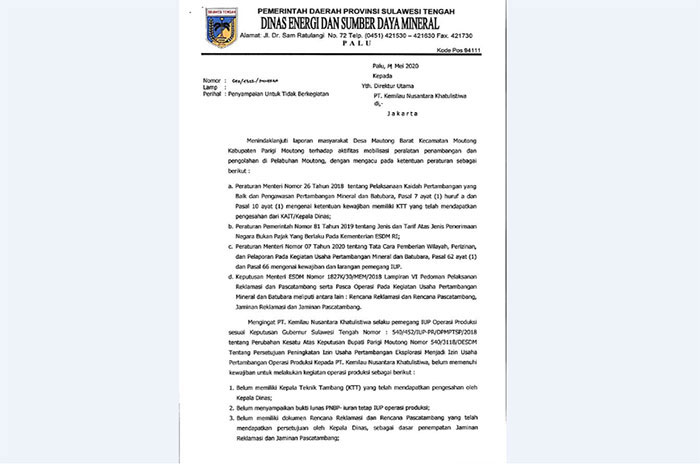 Hal tersebut tertuang dalam surat bernomor 540/4522/MINERBA yang dilayangkan oleh Dinas ESDM Provinsi Sulteng yang diupload oleh akun facebook DPRD Parigi Parigi moutong terhadap Direktur Utama PT KNK.