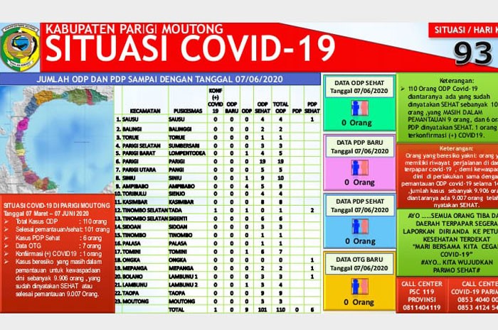Menurut data 7 Juni 2020, satu warga terkonfirmasi positif virus corona berasal dari wilayah kerja Puskesmas Tada Kecamatan Tinombo Selatan Parigi Moutong Sulawesi Tengah.