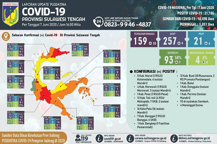 Menurut data gugus tugas covid-19 Sulteng 7 Juni 2020, 20 kasus baru terkonfirmasi virus corona Sulteng terdiri dari 16 orang positif corona dari Kota Palu, dua orang dari Kabupaten Morowali, satu dari Kabupaten Parigi Moutong dan satu dari Kabupaten Donggala.