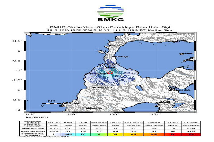 BMKG mencatat pada Minggu 5 Juli 2020, pukul 19.52 WITA, gempa berpusat di darat, 8 Km arah baratdaya Bora, guncang Kabupaten Sigi Sulteng.