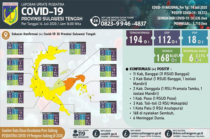 Sulteng hari ini, sudah 194 total kasus positif covid-19. Pasien sembuh jumlahnya 168 orang dan enam meninggal dunia. Sehingga, tersisa 20 orang sedang menjalani perawatan.