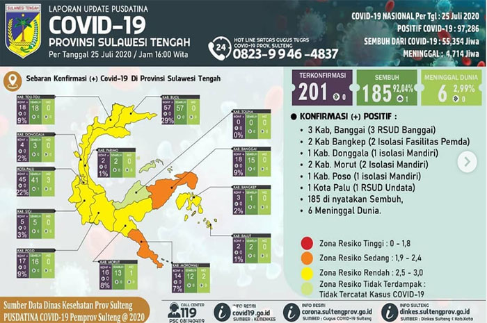 Data virus corona Sulteng hari ini, sudah 201 total kasus positif covid-19. Pasien sembuh jumlahnya 185 orang dan enam meninggal dunia. Sehingga, tersisa 10 orang sedang menjalani perawatan.