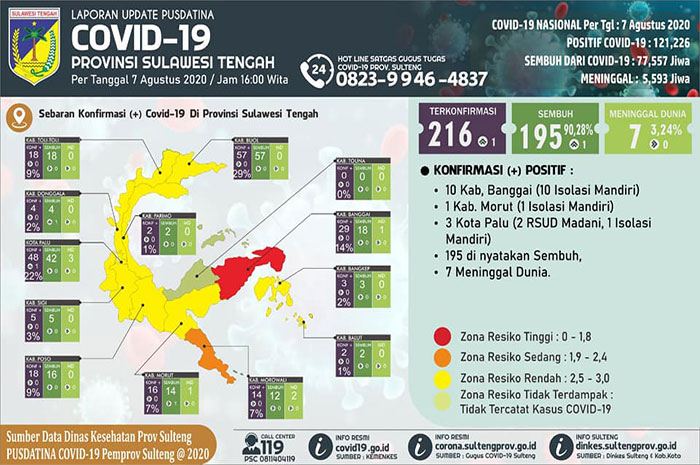 Namun, Pusdatina juga mencatat 12 kabupaten memiliki kasus terkonfirmasi positif virus corona sebagai berikut, 48 kasus dari Kota Palu (42 sembuh, 3 meninggal), lima dari Kabupaten Sigi (5 sembuh), 18 dari Poso (18 sembuh).