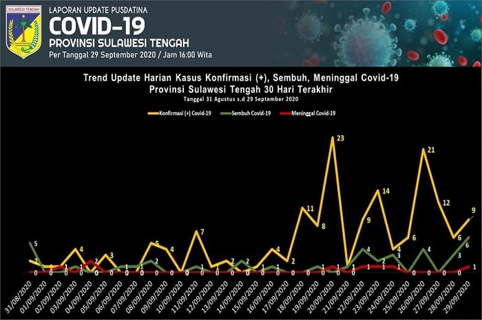 Dalam rilisnya Selasa 29 September 2020, temuan sembilan kasus baru covid-19 Sulteng tersebar di sejumlah wilayah yaitu Kota Palu lima kasus serta Donggala Poso, Sigi, dan Toli-toli yang masing-masing mencatat satu kasus.
