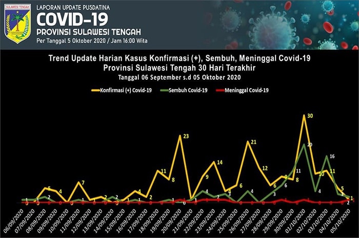 Sementara itu, berdasarkan rilis Pusdatina Sulteng terdapat penambahan satu orang terkonfirmasi positif virus corona asal Kota Palu.