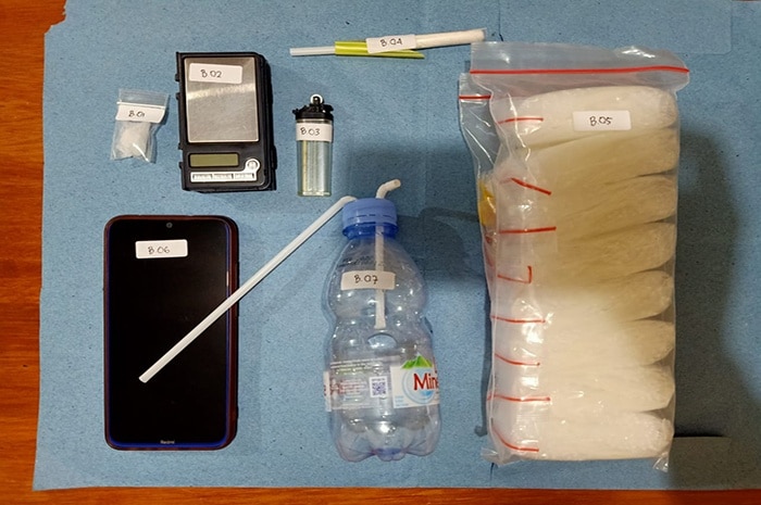 Selain itu, Polisi juga menemukan barang bukti lainya berupa dua buah timbangan digital, dua pack ukuran besar plastik klip bening, satu korek api tanpa kepala, tiga buah sendok yang terbuat dari pipet plastik, satu buah alat hisap sabu dan satu unit handphone merk Redmi warna biru.