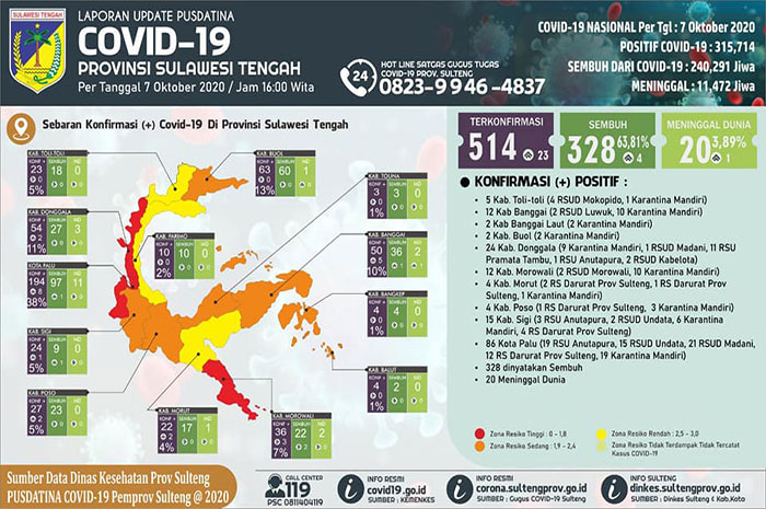 Berita sulawesi tengah, gemasulawesi- Update data Pusdatina Sulteng 7 Oktober 2020, Provinsi Sulawesi tengah ketambahan 23 pasien terkonfirmasi positif corona.