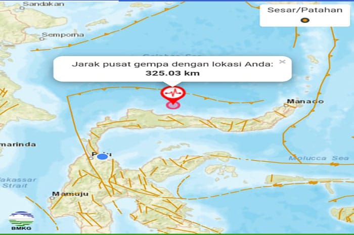 Episenter gempa bumi tektonik terletak pada koordinat 1,50 Lintang Utara dan 121,97 Bujur Timur, pada kedalaman 10 Km.
