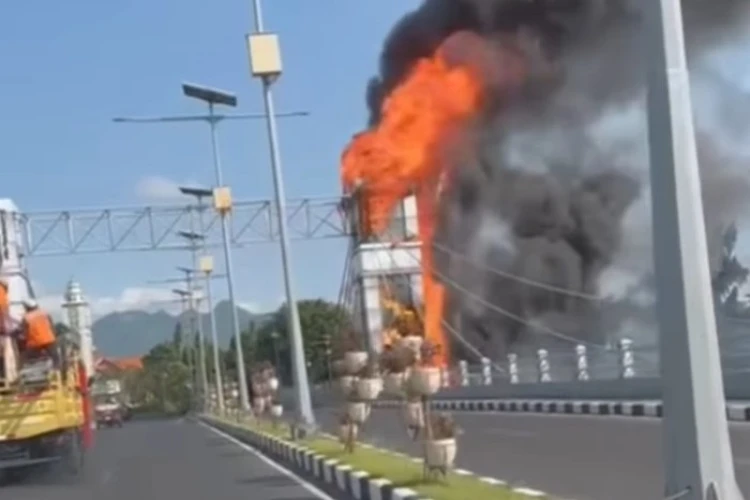 Kebakaran ini pun sontak mengundang perhatian warga sekitar yang menyaksikan api melalap bagian tugu jembatan dengan cepat.