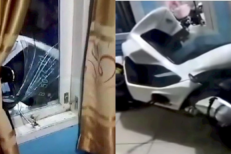 Bahkan, sepeda motor putih yang terparkir di luar rumah juga ikut terkena dampak, dengan bagian sisi motor menimpa kaca jendela yang pecah.