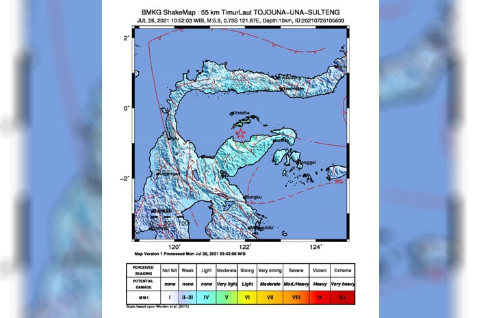 Hasil info pendahuluan BMKG menunjukkan gempa Touna ini berkekuatan M 5,9 yang selanjutnya dilakukan pemutakhiran menjadi M 5,8.