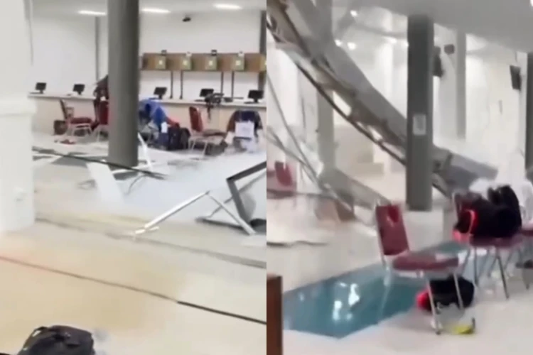 Dalam video yang viral di media sosial, tampak air mengalir deras dari atap yang ambruk, merusak beberapa bagian venue.