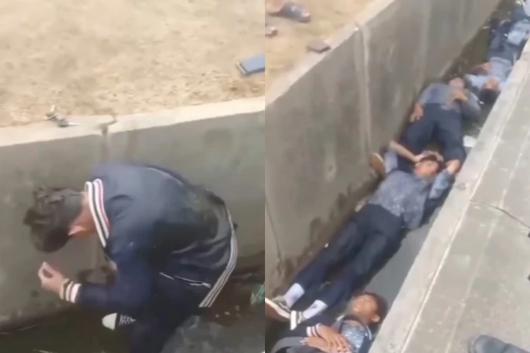 Dalam video tersebut, tampak jelas para pelajar berseragam lengkap itu harus berbaring di selokan yang penuh air kotor, disaksikan oleh beberapa warga dan petugas keamanan setempat.