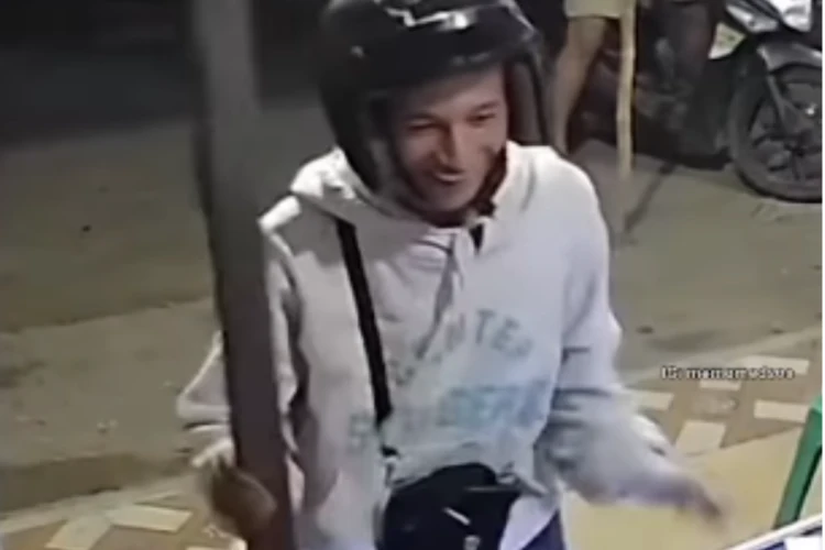 Pada video tersebut, tampak mulanya seorang pria muda yang menggunakan jaket putih dan memakai helm berinteraksi dengan pemilik konter.
