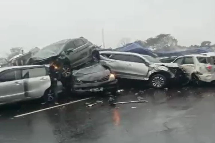 Dalam video yang beredar di media sosial, terlihat beberapa mobil dalam kondisi rusak parah, bahkan ada yang bertumpuk dan terbalik di lajur seberang.