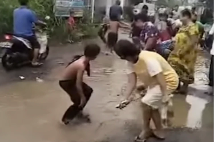 Dalam rekaman video itu, terlihat beberapa anak-anak sedang mencoba menangkap ikan lele yang berenang di genangan air di tengah jalan.