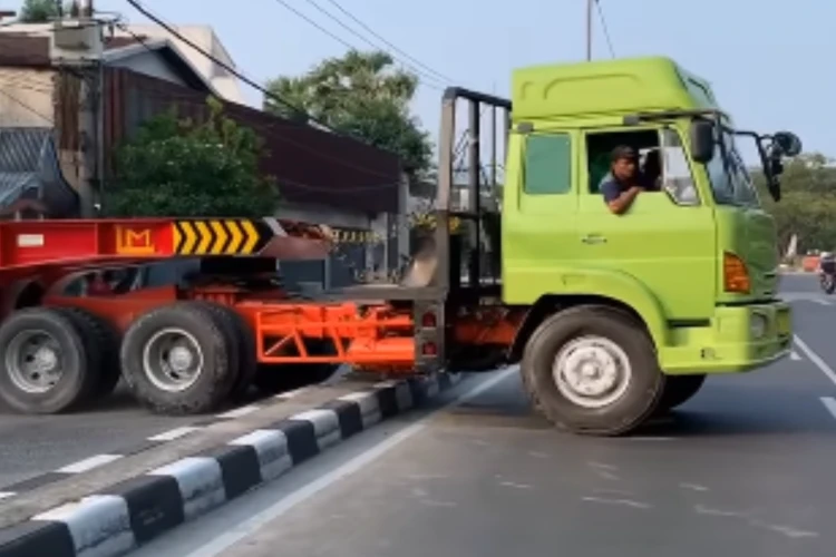 Surabaya, gemasulawesi - Sebuah truk trailer panjang menjadi perhatian di Surabaya, Jawa Timur, usai aksinya menerobos pembatas jalan raya.