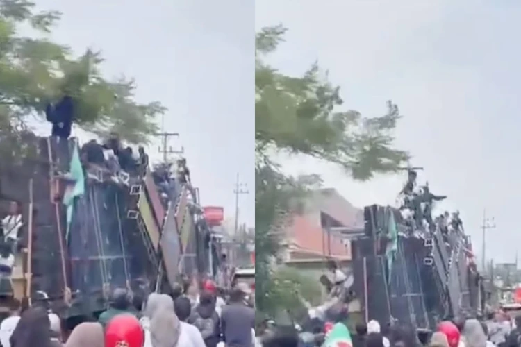 Seorang pria terjatuh dari truk bermuatan sound horeg yang sedang digunakan dalam kampanye.