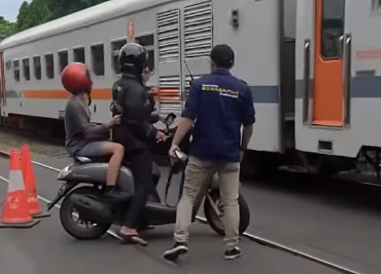 Aksi cepat tersebut menyelamatkan nyawa pengendara yang berboncengan, karena hanya beberapa detik kemudian KA Commuter Line Bandung Raya tujuan Cicalengka melintas.