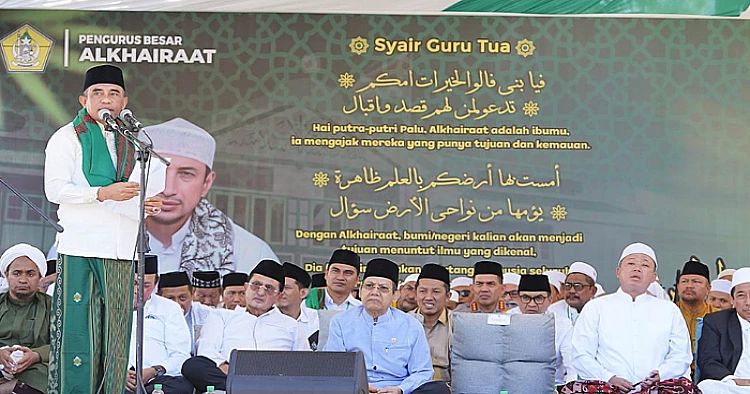 Penghormatan tersebut disampaikannya dalam rangkaian acara puncak peringatan Haul Guru Tua yang ke-57, yang digelar di kompleks perguruan pusat Alkhairaat, Jalan Sis Al-jufri, Kota Palu, pada Sabtu, 12 April 2025.