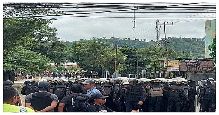Ketegangan meningkat ketika petugas keamanan harus membubarkan massa yang tetap ngotot memblokir area di sekitar Mapolresta Sorong Kota.