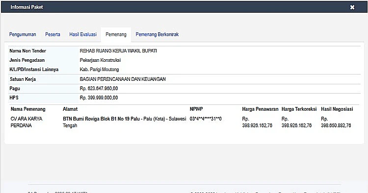 Sayangnya, akibat nilai HPS yang terkoreksi ke angka Rp398.926.162,76, akhirnya proses Rehab ruangan wakil Bupati Parigi moutong menjadi pengadaan langsung.