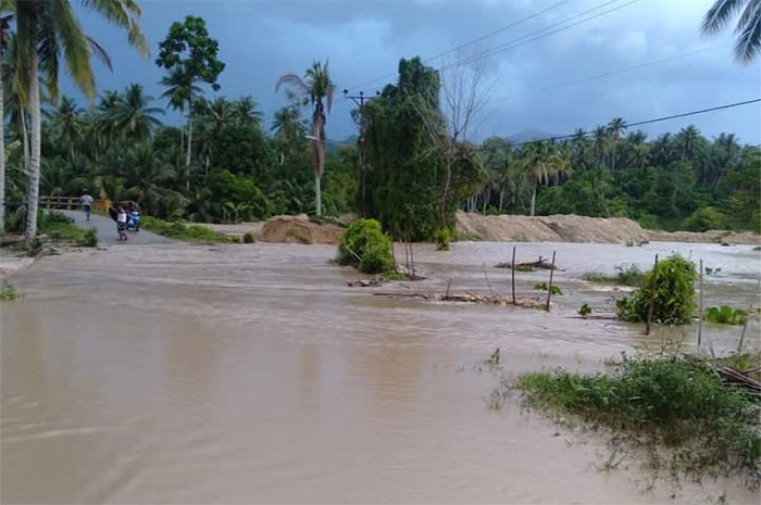 Luapan air sungai menggenangi sisi utara sekitar 150 meter dari arah Sungai, menuju kedataran lebih rendah ke arah Desa Kayuboko.