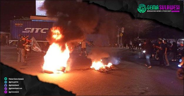 Mahasiswa dan warga sekitar berkumpul untuk memblokir jalan di depan kampus Universitas Muslim Indonesia (UMI) di Jl Urip Sumohadjo pada Kamis malam 15 September 2022.