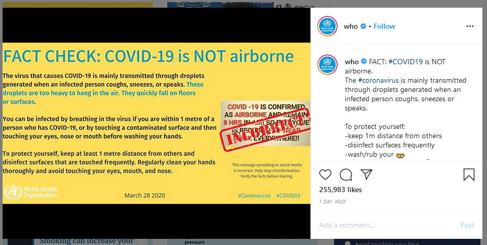Sulawesi Tengah, Gemasulawesi.com- Organisasi World Health Organization (WHO) melalui akun Instagram resminya sebut penyebaran virus corona tidak lewat udara.