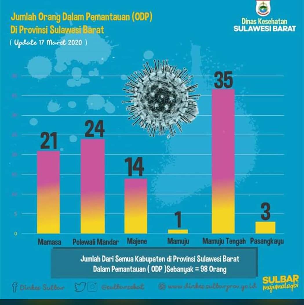 “Totalnya sebanyak 98 pasien di Provinsi Sulawesi Barat masuk ODP terkait virus corona Kabupaten Majene salah satunya,” ungkap Kepala Dinas Kesehatan Provinsi Sulawesi Barat, di ruang kerjanya, Kamis 19 Maret 2020.