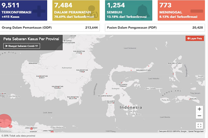 Sementara itu, berdasarkan data nasional situs covid19.go.id, jumlah pasien positif terinfeksi Virus Corona (Covid19) bertambah menjadi 9511 orang, pada 28 April 2020.