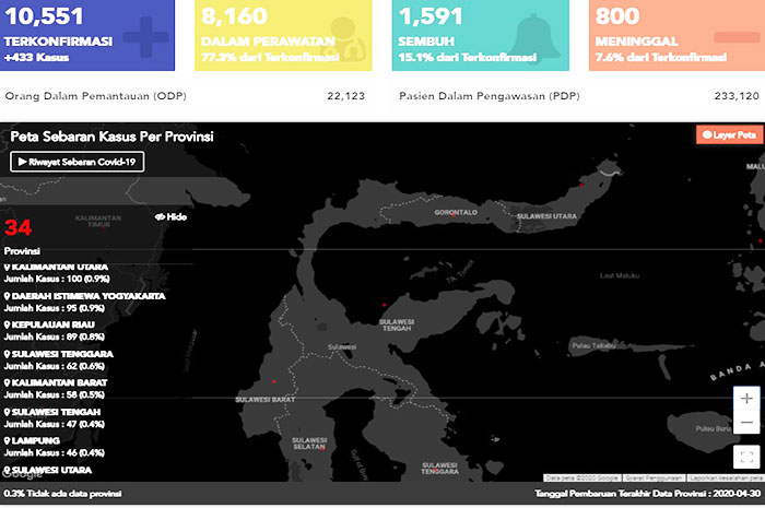 Sementara itu, berdasarkan data nasional situs covid19.go.id, jumlah pasien positif terinfeksi Virus Corona (Covid19) bertambah menjadi 10551 orang, pada 1 Mei 2020.