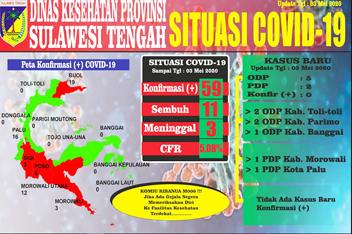Menurut data 3 Mei 2020, tambahan PDP virus corona Sulawesi Tengah berasal dari Kabupaten Morowali dan Kota Palu Sulawesi Tengah.