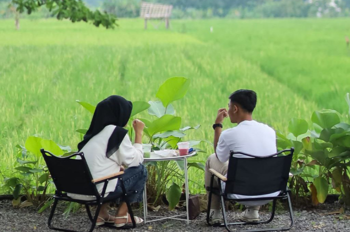 Tempat nongkrong ini berada di tengah sawah sehingga suasananya begitu tenang.