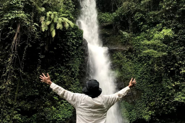 Destinasi ini menyuguhkan pesona air terjun yang mengalir dari ketinggian.
