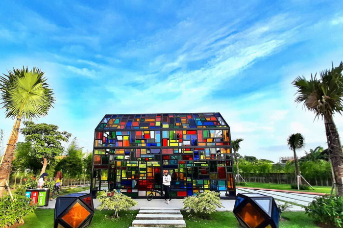 Bangunan mozaik yang ada di sini berbentuk layaknya rumah dengan atap segitiga. Dikelilingi tanaman dan rumput hijau, bangunan satu ini tampak menonjol dengan corak warna-warninya.