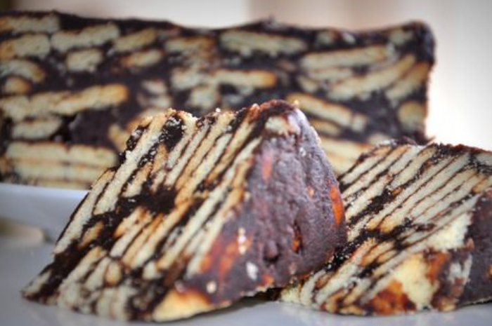 Dengan potongan-potongan biskuit marie yang diaduk dalam adonan cokelat kental, kue ini membentuk pola unik yang mirip dengan batik, seni tradisional Indonesia.