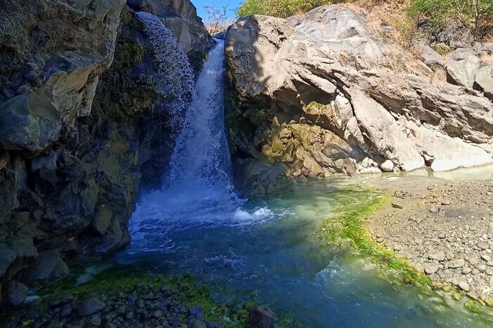 Formasi bebatuan yang terpampang megah dan aliran air yang mengalir dengan gemerlap menciptakan lanskap yang sangat menarik.