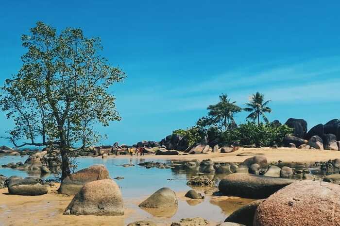 Batu-batu besar yang ada di sekitar pantai menciptakan peluang untuk bermain air dan berenang dari satu batu ke batu lainnya.