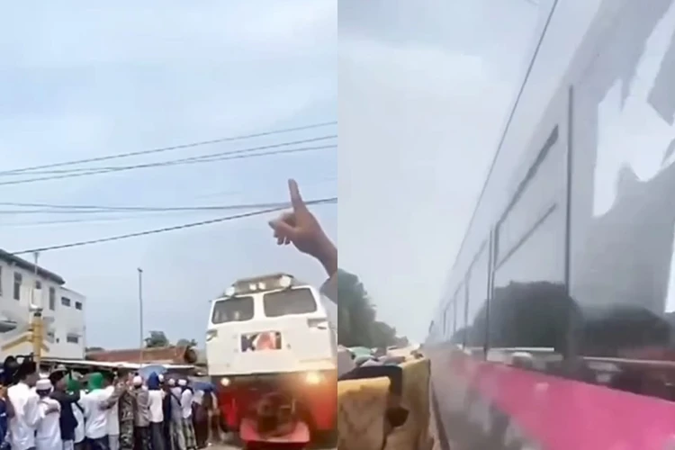 Dalam video yang kini viral di media sosial, jamaah yang berada dekat dengan rel terlihat hanya sedikit bergeser ketika sebuah kereta api melintas.