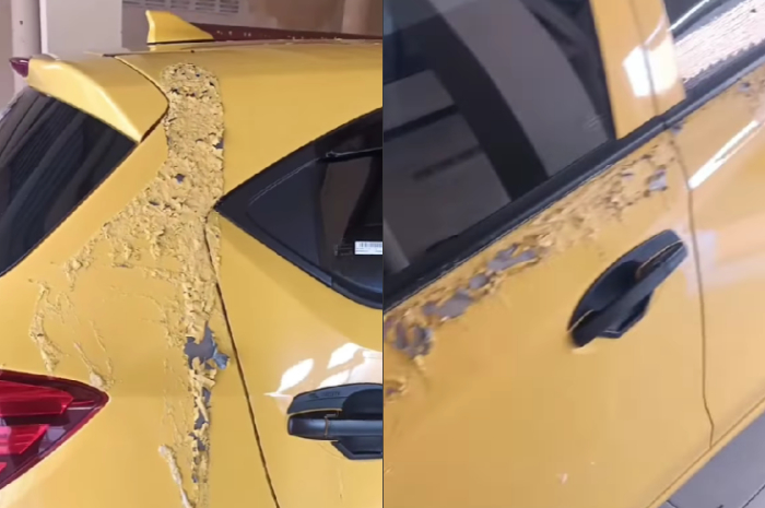 Dalam video yang diunggah akun media sosial @terang_media pada 9 Mei 2023, sebuah cat pada bodi mobil yang berwarna kuning tersebut terlihat hancur, diduga disebabkan oleh sang tetangga.