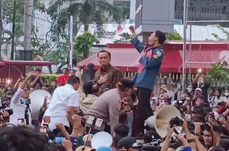 Potret momen ketika Mensesneg Prasetyo Hadi menemui para mahasiswa yang demo di Jakarta