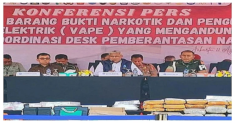 Jumpa pers terkait pemusnahan barang bukti narkotika serta pengungkapan kasus rokok elektrik bercampur narkoba di Lapangan Kantor BNN RI. Source: (Foto/ANTARA)
