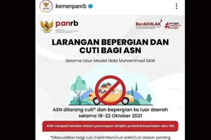 “19 Oktober nanti adalah Maulid Nabi Muhammad SAW. Namun, libur peringatannya adalah pada 20 Oktober 2021. Berdasarkan SE Menteri PAN-RB Nomor 13/2021 ASN dilarang bepergian dan cuti selama 18-22 Oktober 2021,” demikian laman Instagramnya.