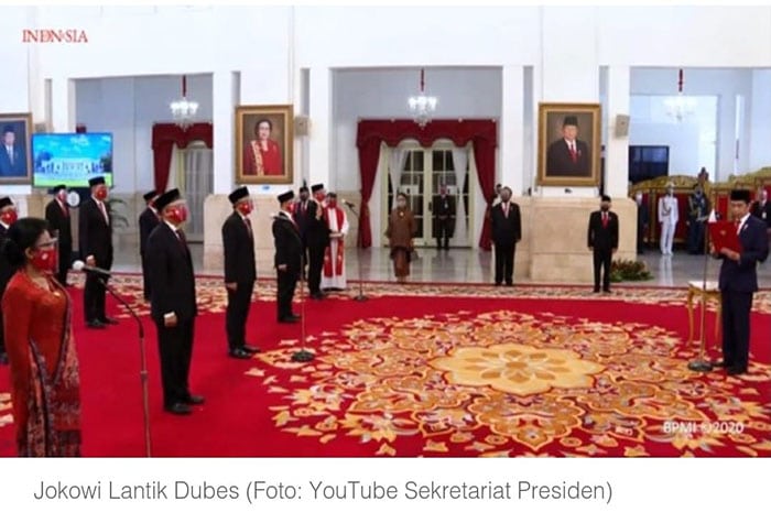 “Keputusan Presiden Republik Indonesia Nomor 127/P Tahun 2021 tentang Pengangkatan Duta Besar Luar Biasa dan Berkuasa Penuh Republik Indonesia dengan Rahmat Tuhan Yang Maha Esa, Presiden Republik Indonesia, menimbang dan seterusnya, mengingat dan seterusnya, memutuskan, menetapkan dan seterusnya, mengangkat sebagai Duta Besar Luar Biasa dan Berkuasa Penuh Republik Indonesia,” ujar Deputi Bidang Administrasi Aparatur Kementerian Sekretariat Negara Nanik Purwanti saat membacakan Keputusan Presiden.