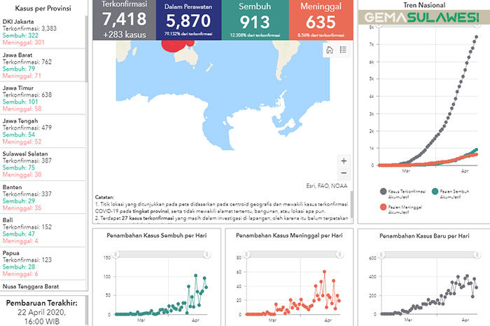 Sementara itu, berdasarkan data nasional situs covid19.go.id, jumlah pasien positif terinfeksi Virus Corona (Covid19) bertambah menjadi 7418 orang, pada 22 April 2020.