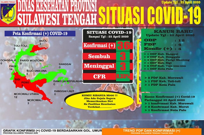 Sementara itu, data terkini situs resmi dinkes.sultengprov.go.id, positif virus corona Sulawesi Tengah kembali bertambahn hingga mencapai 36 orang.