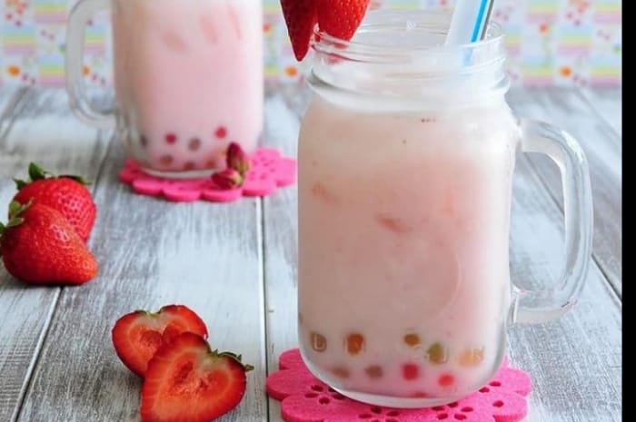Satu pound stroberi segar, buang tangkainya dan iris, sejumput garam, satu bungkus mutiara boba instan berukuran 9 ons, dan satu liter susu jenis apa pun.