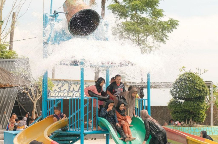 Kolam renang di wisata ini menyediakan berbagai permainan seru yang bikin betah.